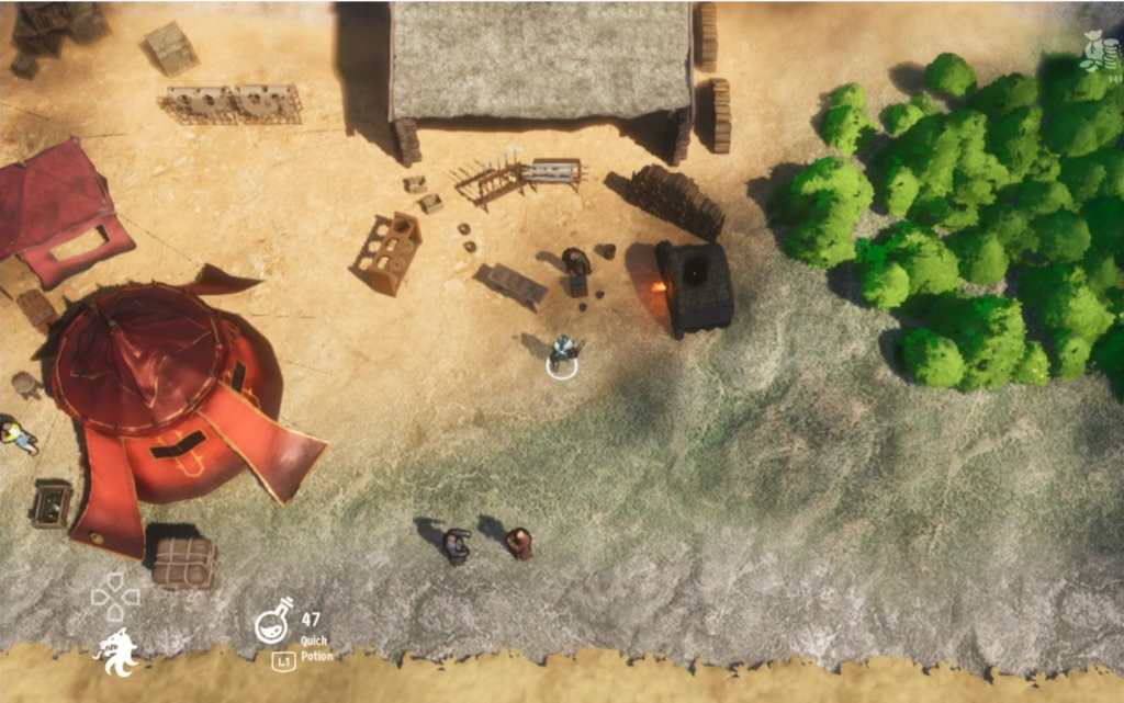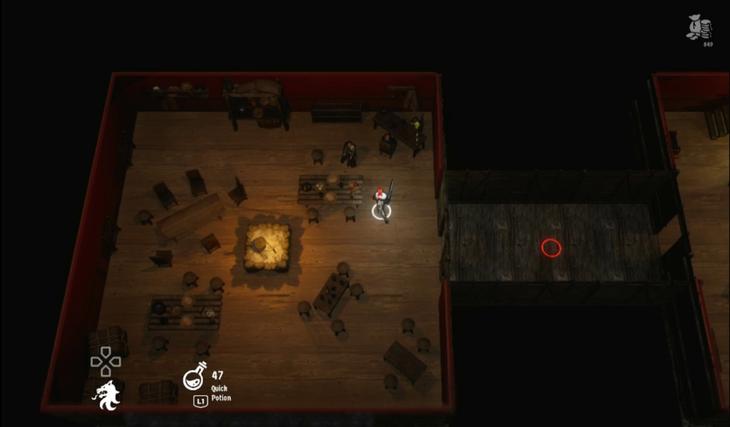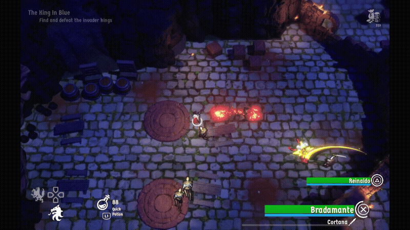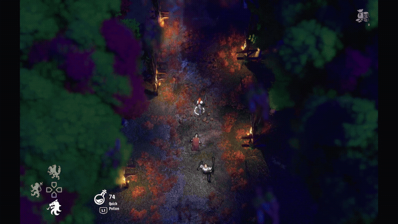 Our approach to Hack&Slash is fast and chaotic, with several characters in the party that fight alongside each other and a permissive potion command that heals the character with lowest health immediately.